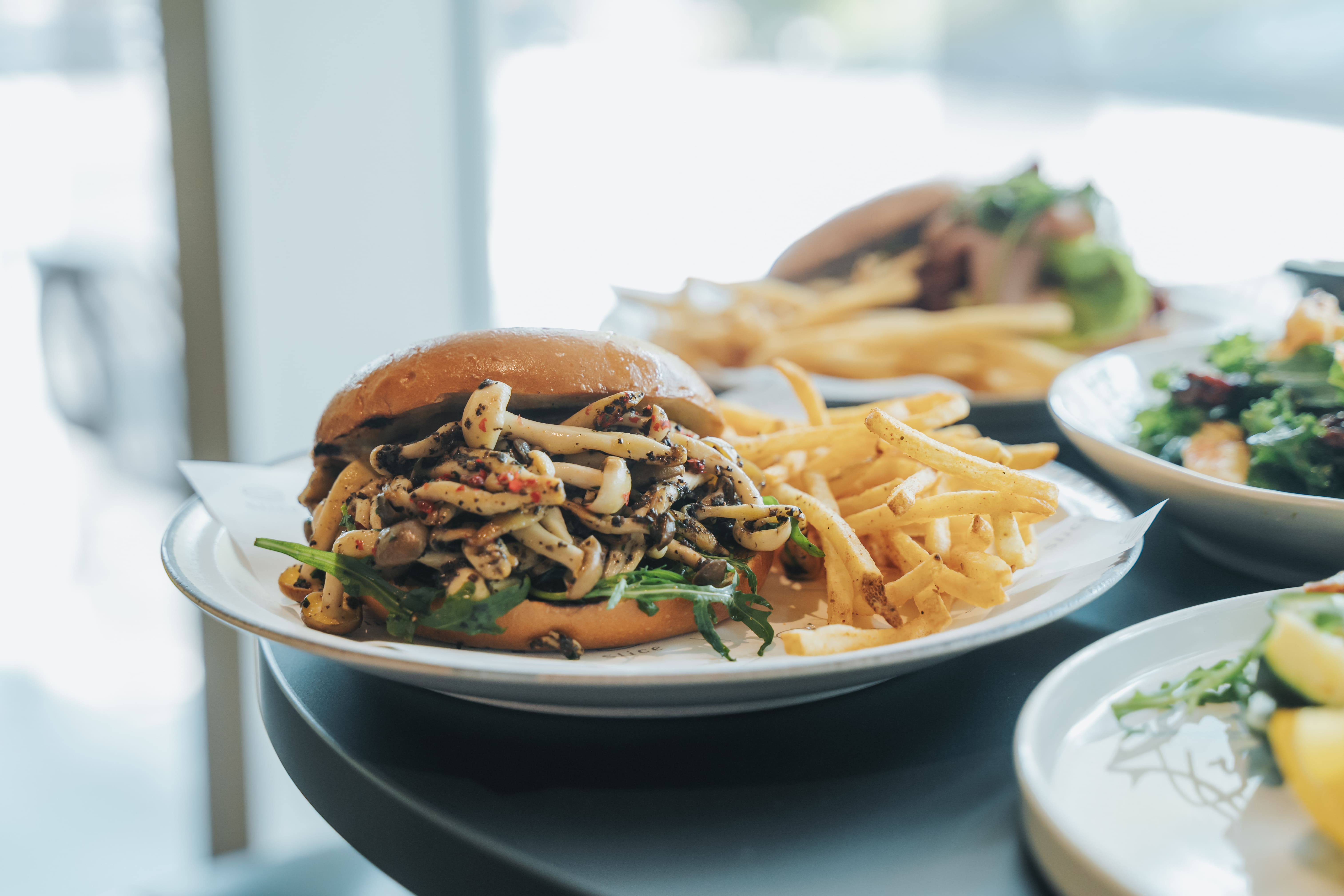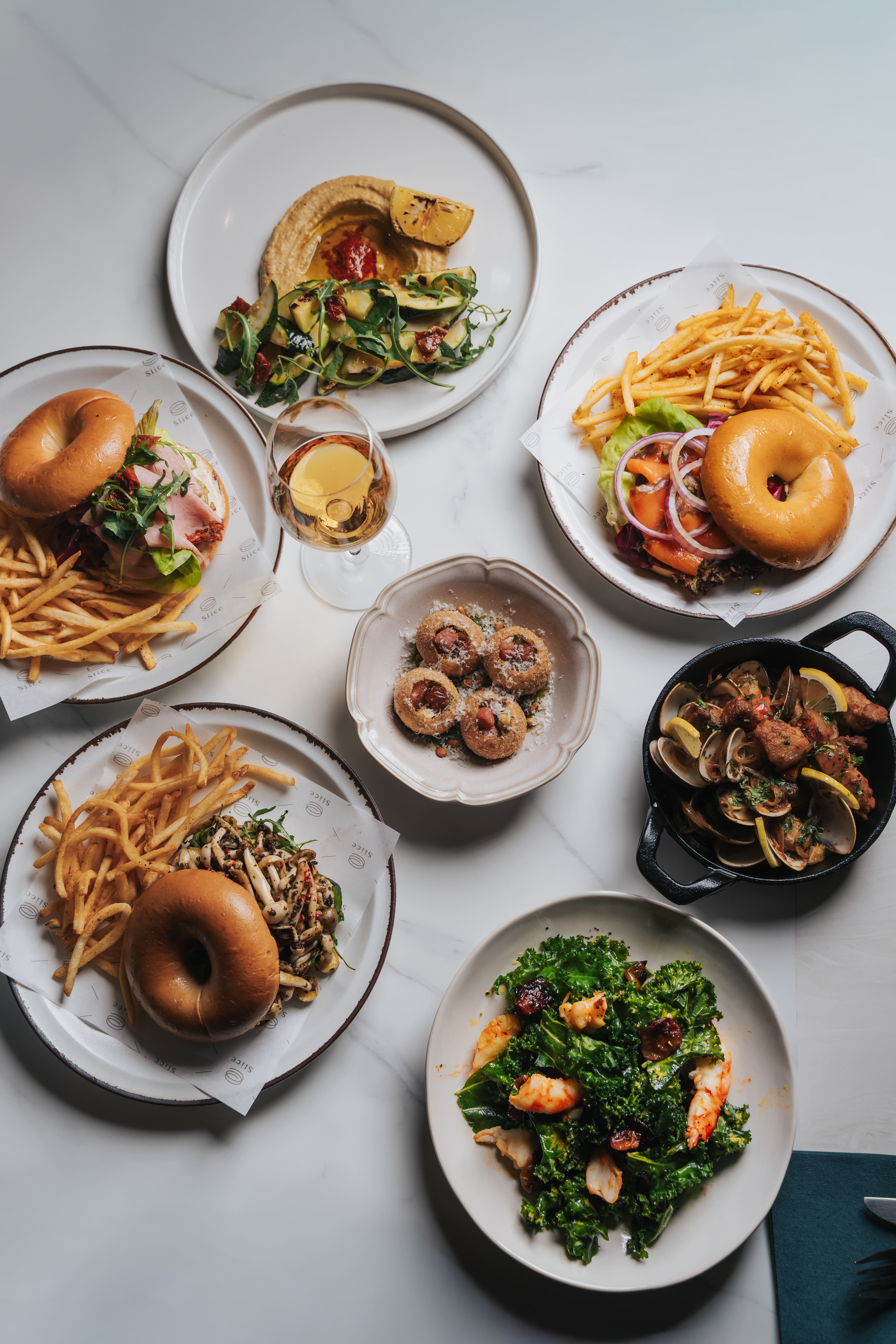 擴店同步帶來跨界合作,Slice 與台灣貝果品牌好丘 Good Cho's 合作,開發三款開放式夾餡貝果,直接使用 Slice 店內販售的起司、火腿、漬物與醬料為食材。三款分別是「松露蕈菇嫩蛋貝果」、「經典凱莉燻鮭起司貝果」,以及以歐洲蜂蜜火腿、彩色番茄、芝麻葉組成、被主廚私下叫作「紅綠燈貝果」的第三款。