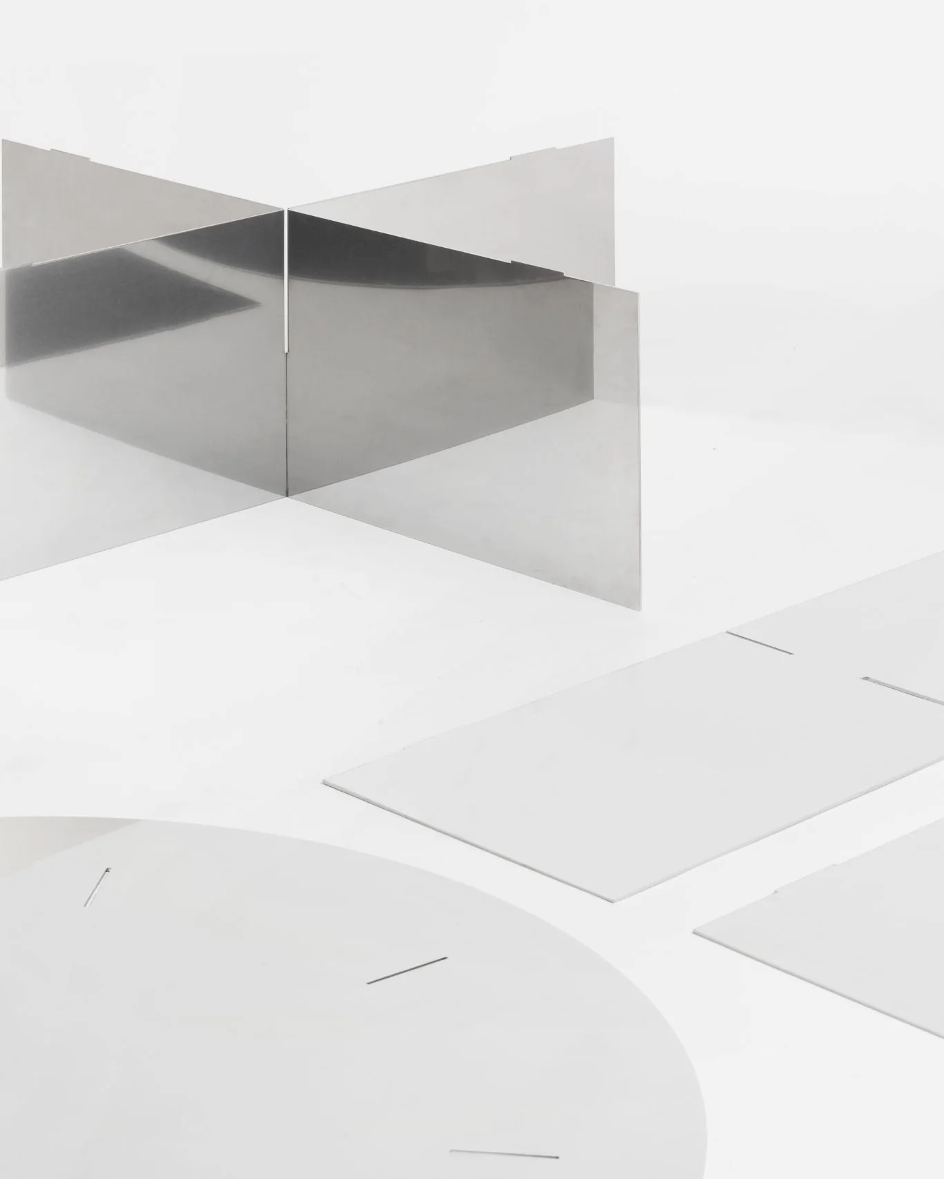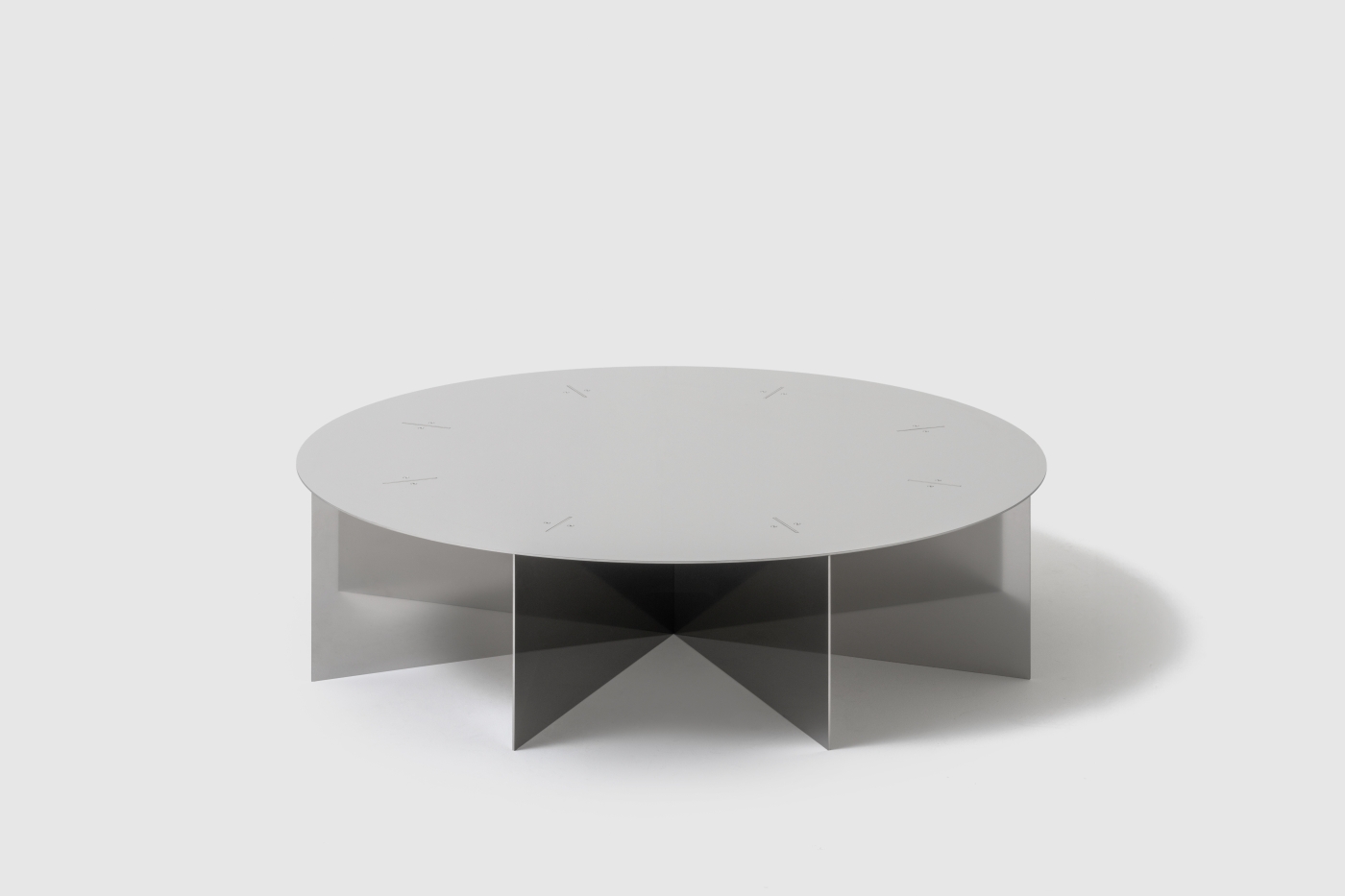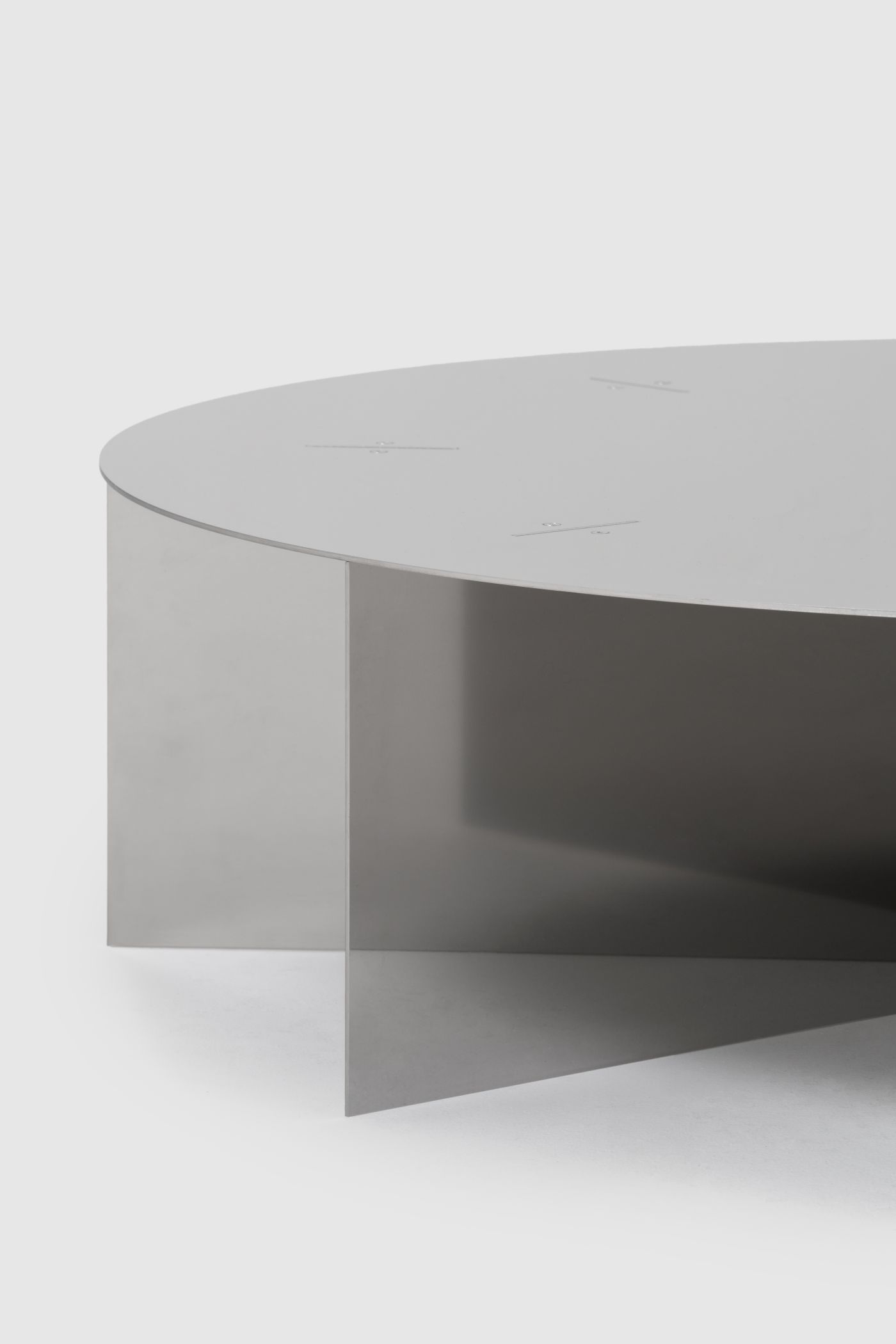 桌面直徑 105 公分,高度僅 25.5 公分,重達 46 公斤。低重心、大桌面,視覺上有一種不動如山的穩定性。鏡面不鏽鋼同時在融入空間與重組空間,周遭的牆面、光線、人的移動,都在桌面上被折疊進去。NM02 的邊界是模糊的,但它在空間裡的重力是確定的。它不是一件你繞著走的家具,而是一個讓空間以它為中心重新校準的物件。
