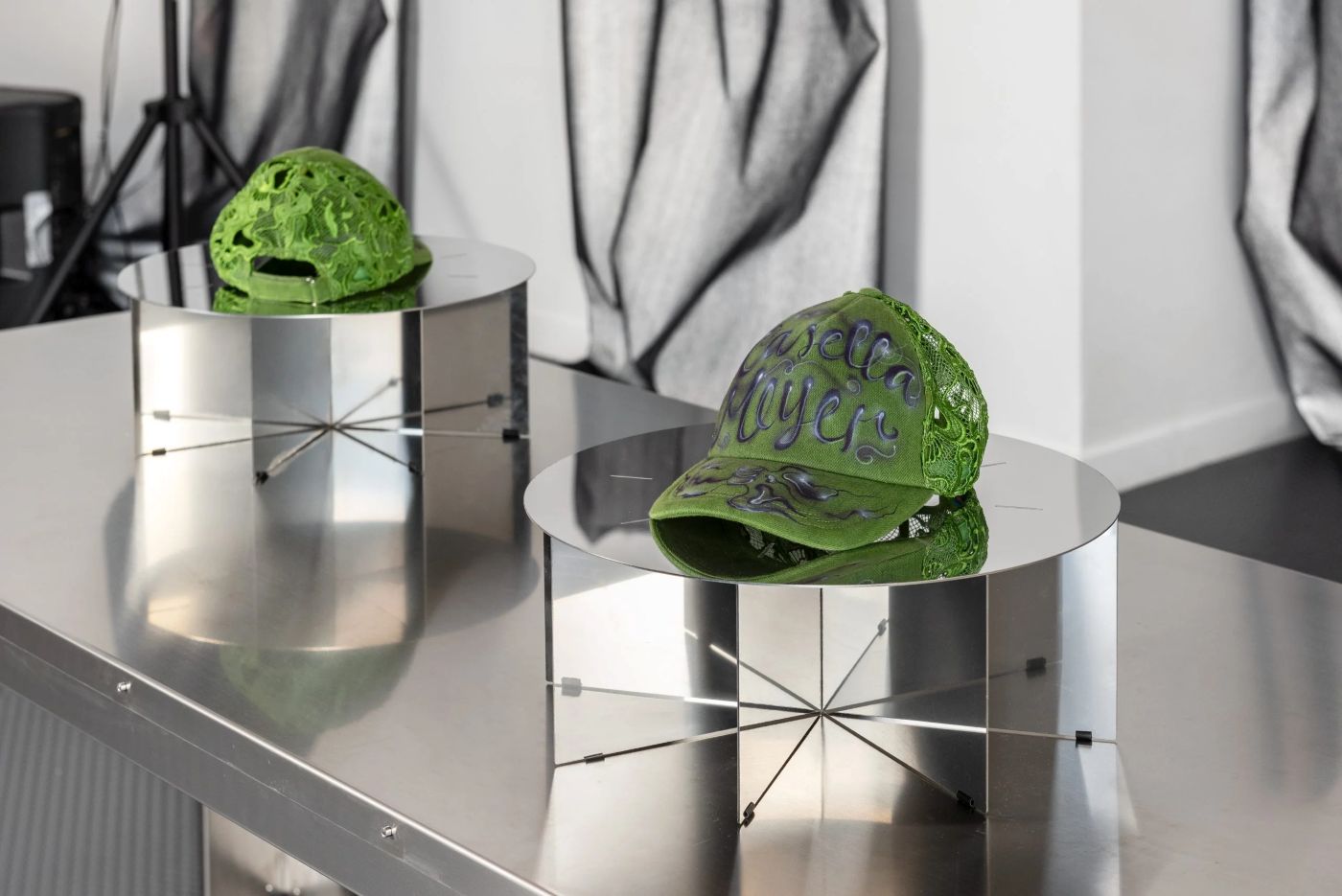 NM3 的工作範圍不止於家具。展場、裝置、空間設計,都是他們同步實踐這套構造哲學的場域。作品曾在米蘭三年展、Alcova、The Makers Show 和 Ordet 畫廊展出;客製化裝置的合作對象橫跨 Adidas、Off-White™️、Our Legacy、Sunnei、Moncler、Laufen 和國際米蘭。不同的委託,同一套工作方法:幾何作為推導結果,材料作為誠實前提,結構作為唯一的語言。