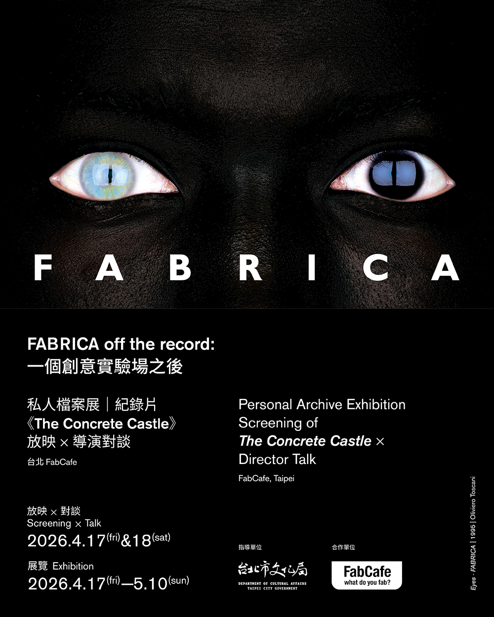 展覽期間也將特別放映由西班牙導演 Laura Sans 拍攝的短片《The Concrete Castle》。影片以 FABRICA 三十週年為背景,記錄超過 400 位歷屆創作者重返義大利的聚會場景,回望 90 年代初期的創作願景,並梳理這個文化實驗室如何在自由協作與社會責任之間持續演變。